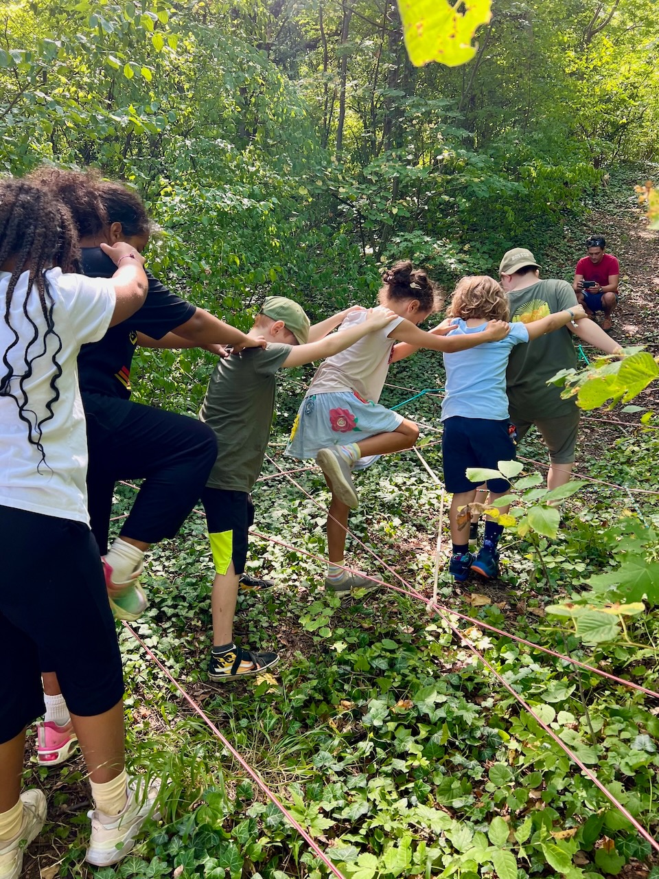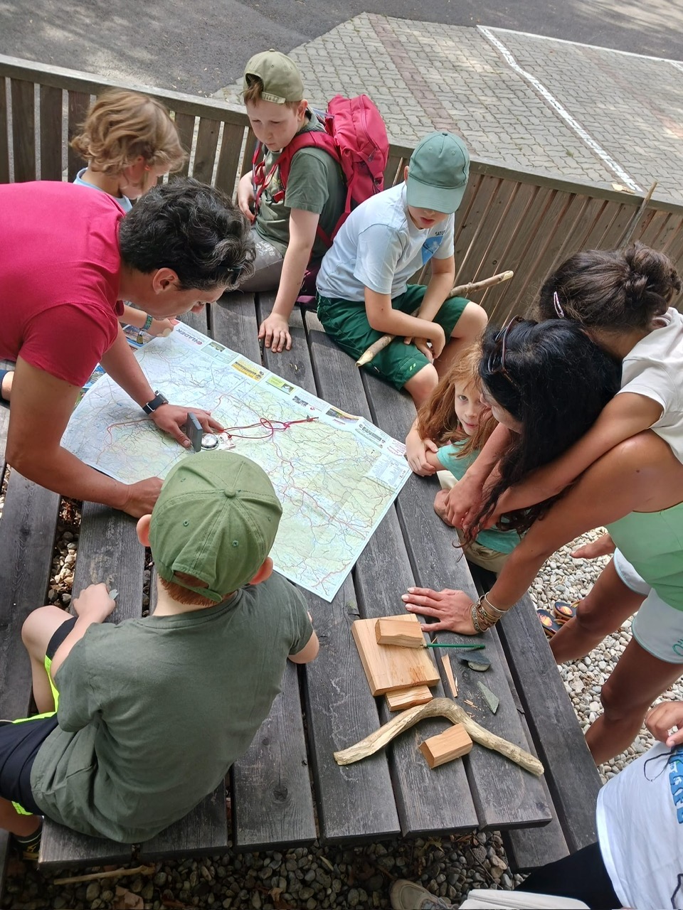 Abenteuerwochen in der Natur: Spuren lesen, Feuer machen, Werkzeuge erstellen, Yoga, Basteln, Orientierungshilfen, Unterschlupf bauen, kooperative Spiele, Hindernisparkours, kreative Herausforderungen, Flusswanderungen, Erste Hilfe, Seilschaukeln