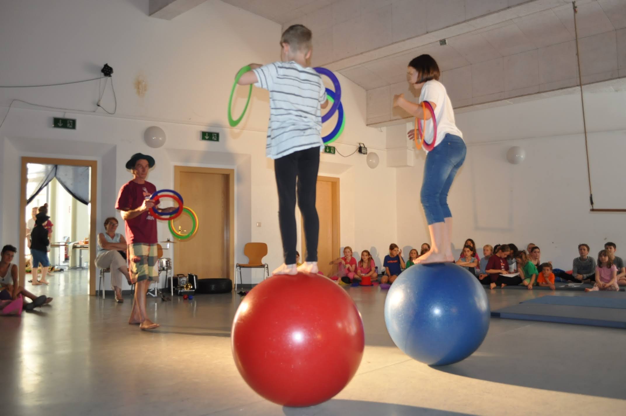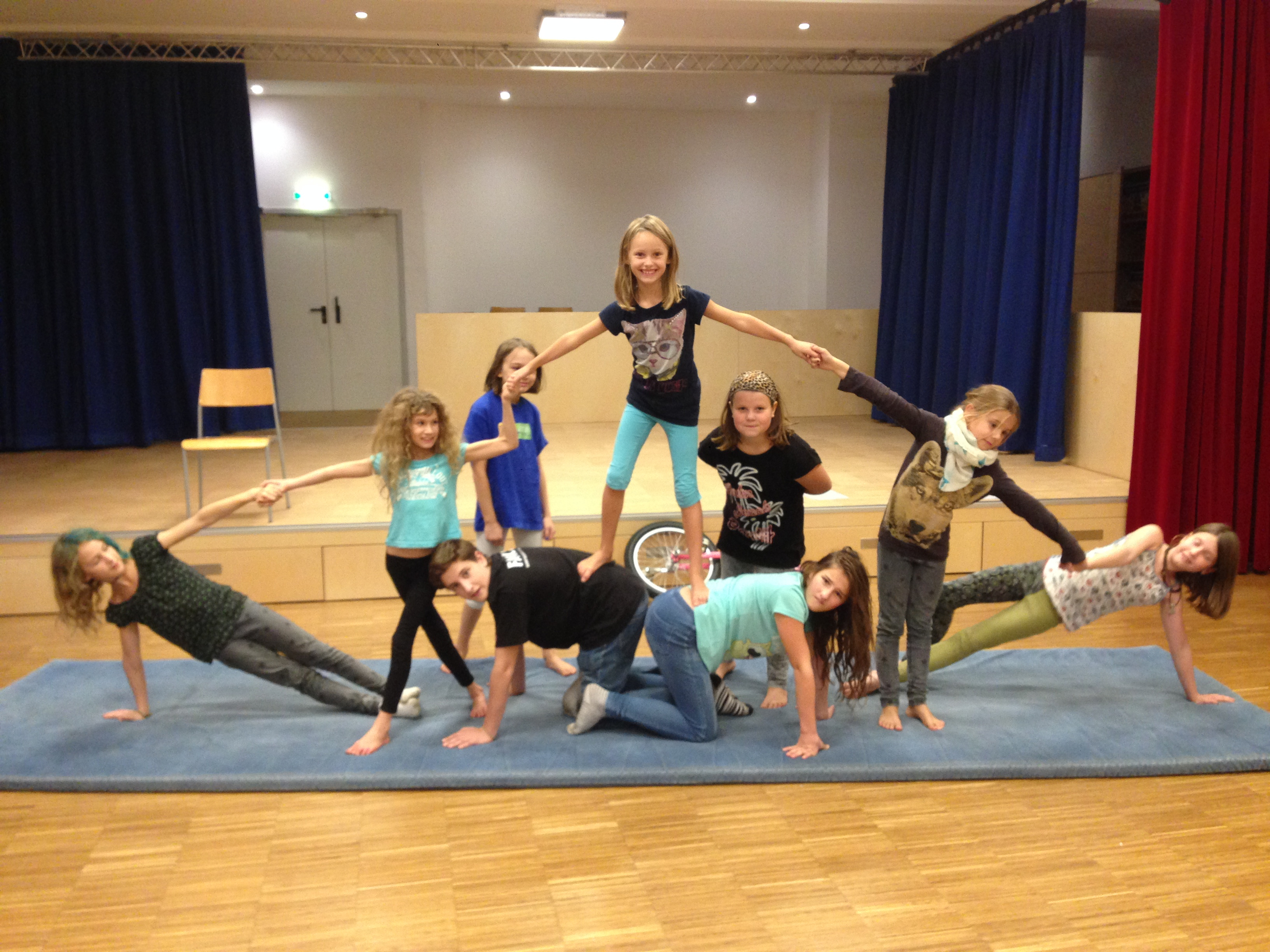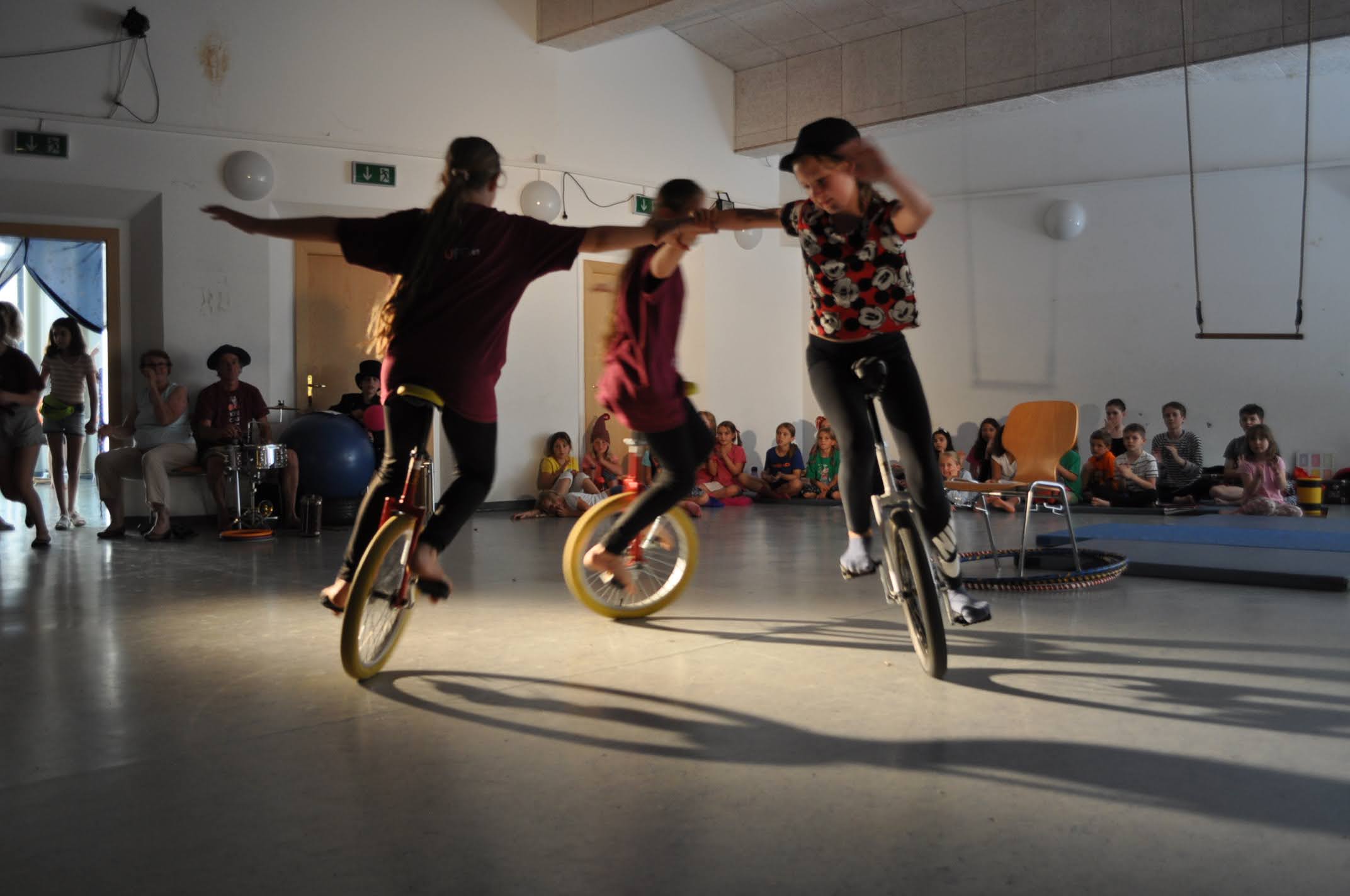 Die Kinder werden als Erstes in die verschiedenen Künste Akrobatik, Jonglieren, Pantomime, Zaubern, Äquilibristik und Clownerie spielerisch eingeführt. Dann werden wir – je nach Interessen der Kinder – kleine Artistengruppen bilden, die sich mit höchstens zwei Disziplinen intensiver befassen.